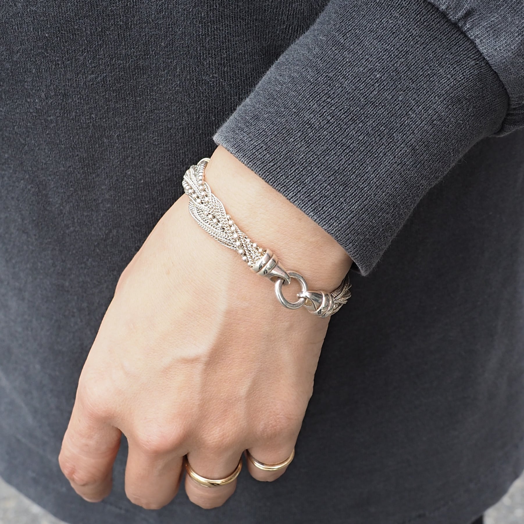 複数のチェーンを重ねたブレスレット。