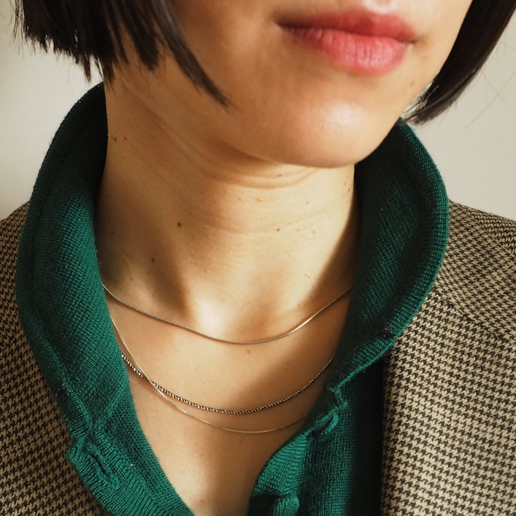 一本でも様になりますが、細いネックレスを重ね付けすると、なお良いなと思います。
